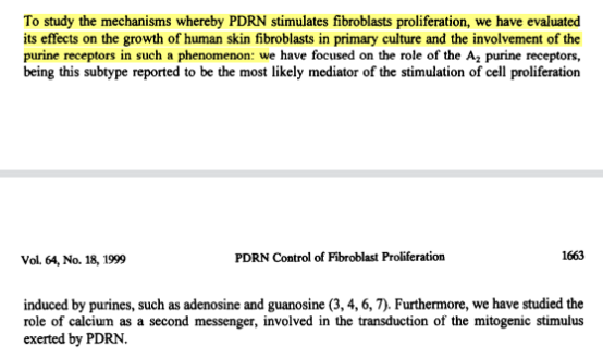 总之,在实验模型中,我们提出PDRN可以刺激原代培养的人皮肤成纤维细胞的增殖,并激活A2嘌呤能受体似乎在这一现象中发挥着重要的作用,尽管不是排他性的。PDRN可以释放广泛的嘌呤和嘧啶化合物,在几乎所有嘌呤受体上共享活性。自A2受体亚型可以刺激细胞增殖和组织修复,实验数据进一步证明,在需要更有效的细胞增殖和组织修复时,使用PDRN作为治疗药物。
