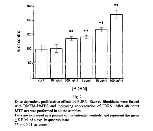 当实验在含有低比例胎牛血清(1%)的培养基中进行时,可以观察到 PDRN 诱导的成纤维细胞生长的增加。