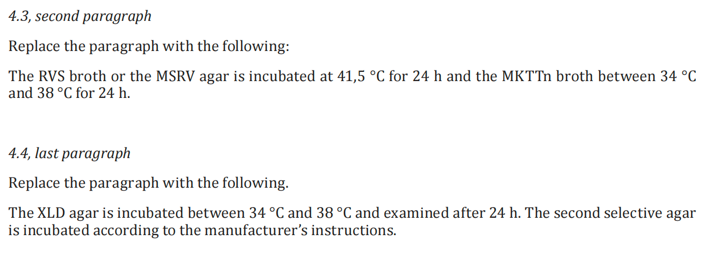 ISO 6579.1-2017将预增菌和纯培养的培养温度,“37℃±1°C”扩大至“34℃~38℃”。