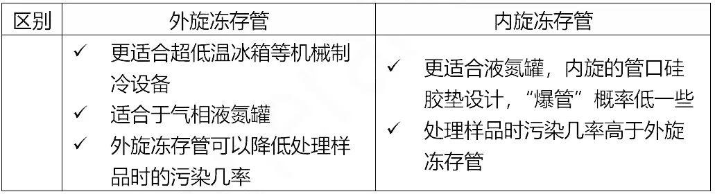 英文名称:ultra-low temperature preservation tube,用于细胞的低温运输和储存的容器。常规的冻存管规格1.5ml、1.8ml、2.0ml、5.0ml,根据样本量及类型,还可以选择冻存袋等。冻存管根据盖子的设计,分为外旋冻存管和内旋冻存管。