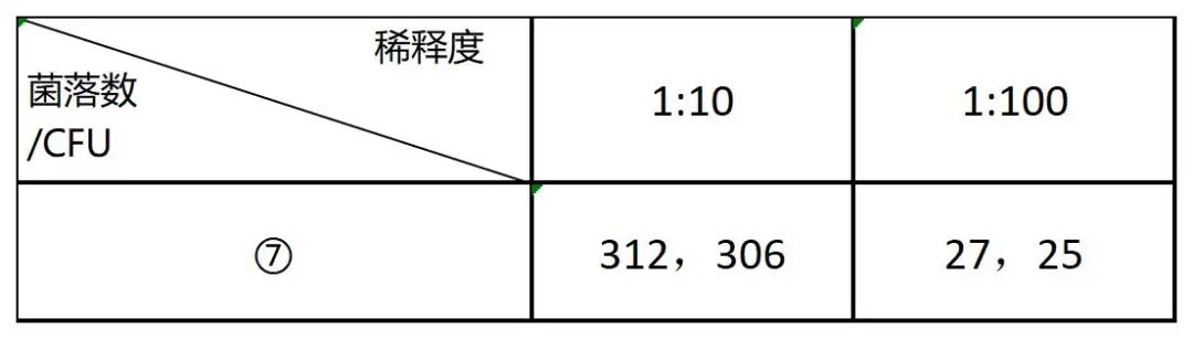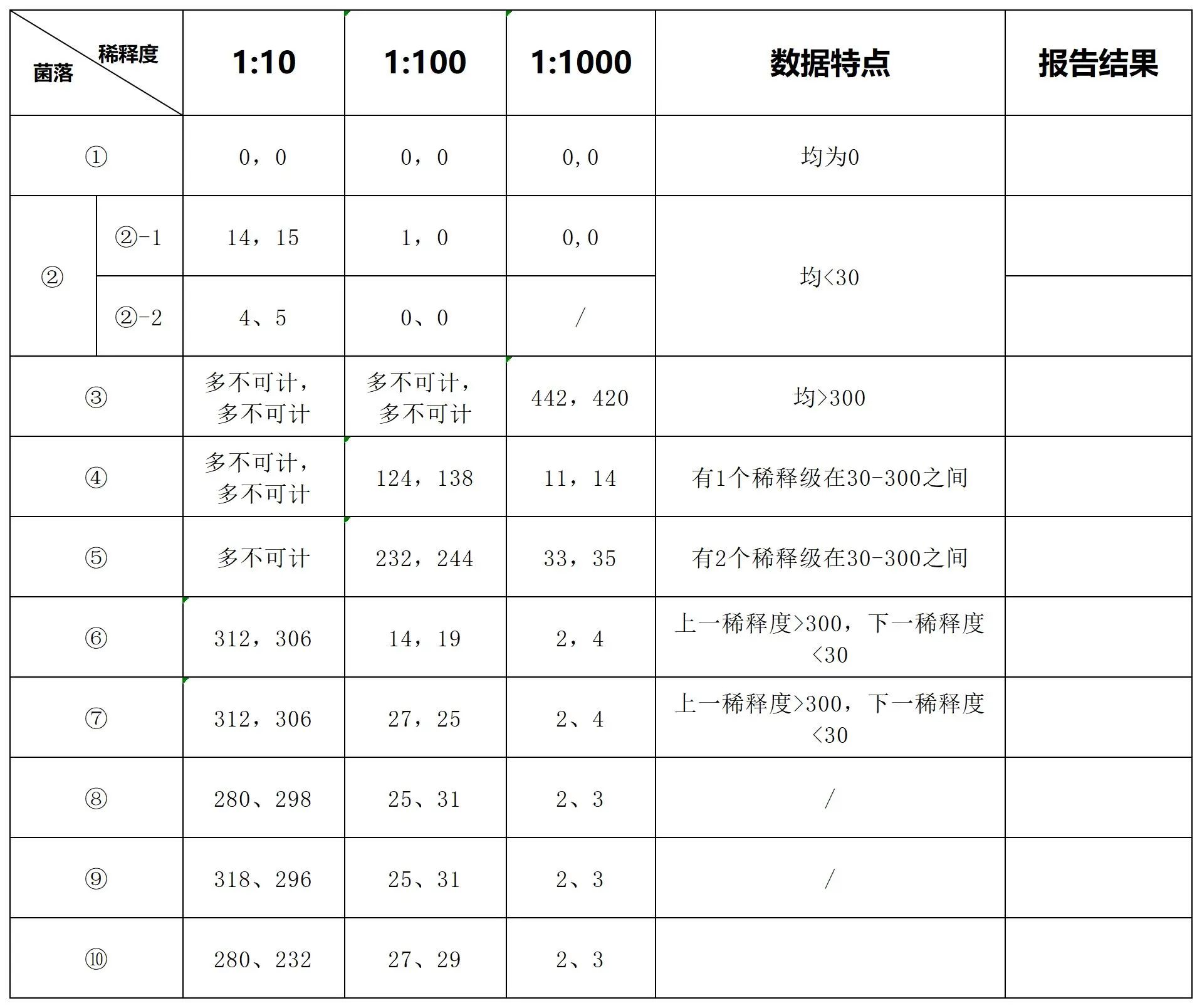 第①组:结果报<1乘以最低稀释倍数,则为<10cfu,如果液体原液未生长,则报<1cfu
