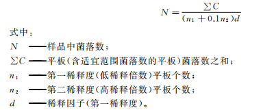 这里小编认为分子取的是含适宜范围菌落数的平板菌落数之和,那么分母n1、n2应解释为“n1:含适宜范围菌落数的第一稀释度平板个数;n2:含适宜范围菌落数的第二稀释度平板个数。”较为妥当。计算: