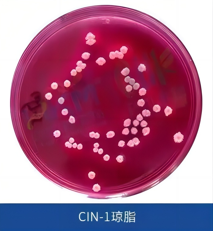 ▶ 将乳与乳制品增菌液或经过碱处理的其他食品增菌液分别接种于CIN-1琼脂平板和改良Y琼脂平板,26℃±1℃培养48h±2h 。