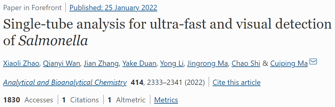 参考文献:Zhao X, Wan Q, Zhang J, Duan Y, Li Y, Ma J, Shi C, Ma C. Single-tube analysis for ultra-fast and visual detection of Salmonella. Anal Bioanal Chem. 2022 Mar;414(7):2333-2341. doi: 10.1007/s00216-022-03904-z. Epub 2022 Jan 25. PMID: 35079852; PMCID: PMC8788404.