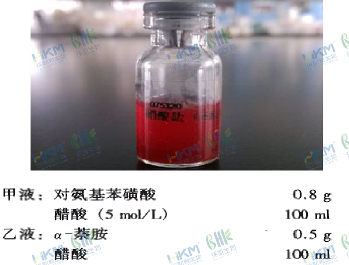 将培养物接种到硝酸盐肉汤中,36℃ ± 1℃培养24 h后,加0.25 mL亚硝酸盐试剂A和0.25 mL亚硝酸盐试剂 B,在10 min内变为红色为阳性反应。