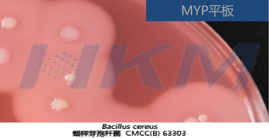 蜡样芽孢杆菌在MYP琼脂平板上生长的典型菌落为直径2 mm-5 mm,菌落表面粗糙,在深红色背景下呈现粉红色或微粉红色,环绕产生5 mm,宽的卵磷脂酶沉淀环。没有根状生长特性(蕈状芽孢杆菌形成根状生长特征)。