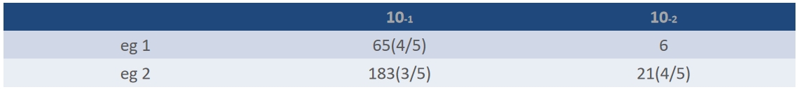 | T --- 样品中蜡样芽孢杆菌菌落数; A1 --- 第一稀释度(低稀释倍数)典型菌落的总数; B1 --- 第一稀释度(低稀释倍数)鉴定为阳性的菌落数; C1 --- 第一稀释度(低稀释倍数)用于鉴定试验的菌落数; A2 --- 第二稀释度(高稀释倍数)典型菌落的总数; B2 --- 第二稀释度(高稀释倍数)鉴定为阳性的菌落数; C2 --- 第二稀释度(高稀释倍数)用于鉴定试验的菌落数; 1.1 --- 计算系数; d --- 稀释因子(第一稀释度)。 |