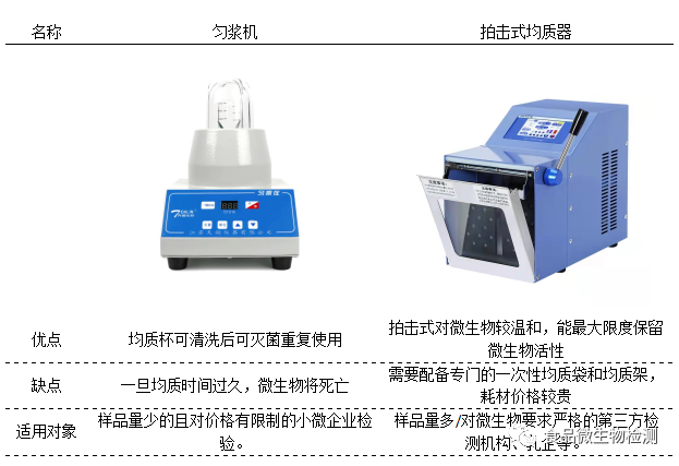 对待检试样液的均质,使试样液的菌含量保持一致,包括匀浆机和拍打式均质器,匀浆机涉及到固体非粉末状样品,拍打式均质器适用于除固体非粉末状样品外的样品