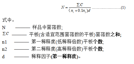 7.1.2 若有两个连续稀释度的平板菌落数在适宜计数范围内时,按式(1)计算: