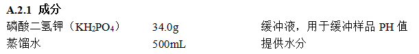 贮存液:称取34.0g的磷酸二氢钾溶于500mL蒸馏水中,用大约175mL的1mol/L氢氧化钠溶 液调节pH 至7.2,用蒸馏水稀释至1000mL后贮存于冰箱。