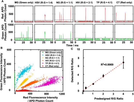 图2 (A)LIF系统记录的每个液滴的红色和绿色荧光时间轨迹;(B)6个样本的红色和绿色荧光强度二维散点图;(C)测量的R/G平均值与设计的R/G值的线性相关性,每个样本至少统计1000个阳性液滴。