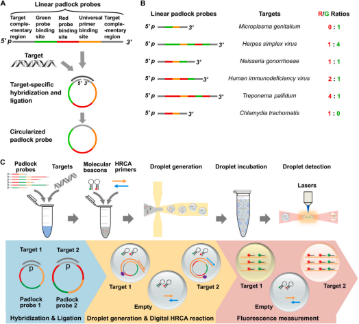 研究所用的锁式探针包括3个部分:与靶标序列互补的2个末端;荧光编码区域(分子信标结合位点)以及HRCA通用引物结合位点。作者设计了6种靶标特异性锁式探针(仅使用2个不同荧光基团的分子信标),分别用于6种性传播病毒的检测:MG,HSV,NG,HIV,TP,CT,其对应的R/G编码分别为:0:1;1:4;1:1;2:1;4:1;1:0。其实验流程可以概述为:①将6种线型锁式探针和待检DNA混合样本于55℃下孵育1h;②探针与对应靶标结合后,线型则会转变成环状。向反应体系中加入HRCA通用引物和分子信标混合后形成3 pL液滴,收集于离心管中并于60℃孵育2 h,进行HRCA反应。随后95℃,5 min使酶失活,37℃ 20min使得分子信标结合到锁式探针结合位点上。③液滴注入检测通道,通过设计的系统测定荧光强度,MATLAB处理数据(图1)。