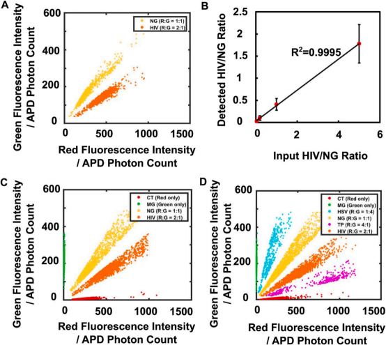 图3 ddRFC的多重检测能力验证,所用的模板全是合成的寡核苷酸。(A)NG和HIV混合样本检测结果中各至少1000个阳性液滴的红色和绿色荧光强度的二维散点图;(B)HIV与NG比值的测量值与理论值之间的线性关系(R2=0.9995,n=3);(C)NG、HIV、CT和MG混合样本检测结果中各至少1000个阳性液滴的红色和绿色荧光强度的二维散点图;(D)NG、HIV、CT、MG、CT和HSV混合样本检测结果中各至少1000个阳性液滴的红色和绿色荧光强度的二维散点图。