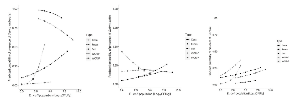 结果表明:大肠杆菌数量与沙门氏菌存在之间存在显著正相关关系,尤其是在土壤和WCR-P样本中。大肠杆菌与李斯特菌菌群数量的关系与样本的种类密切相关:粪便和盲肠样本中弯曲杆菌的初始检出率很高,但随着大肠杆菌浓度的增加,弯曲杆菌的检出率呈下降趋势。土壤和WCR-P样本中,随着大肠杆菌数量的增加,弯曲杆菌存在的概率显著增加。大肠杆菌与李斯特菌之间的关联性较弱,大肠杆菌数量与李斯特菌存在之间存在弱正相关关系。