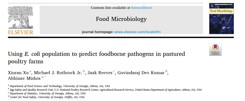 大肠杆菌作为一种常见的肠道指示菌,在粪便污染监测中发挥着重要作用。研究表明,大肠杆菌数量与某些食源性致病菌的存在具有关联,这使其成为潜在的致病菌预测指标。然而,目前关于大肠杆菌与牧场养鸡场食源性致病菌之间关系的研究相对较少。近期,美国佐治亚大学的Abhinav Mishra研究团队在Food Microbiology期刊中发表了题为“Using E. coli population to predict foodborne pathogens in pastured poultry farms”的文章。