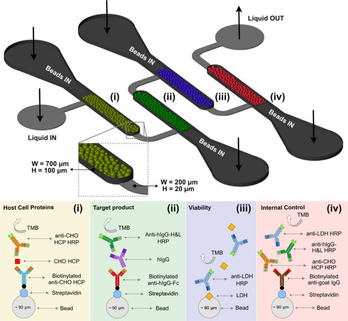 图1 用于珠状免疫分析的微流控盒示意图。该多路复用装置包括四个互联柱,充满不同的偶联珠,每个珠针对一个特定的蛋白质:(i) CHO六方最密堆积,(ii)IgG,(iii)LDH,并包括(iv)一个内部阳性对照