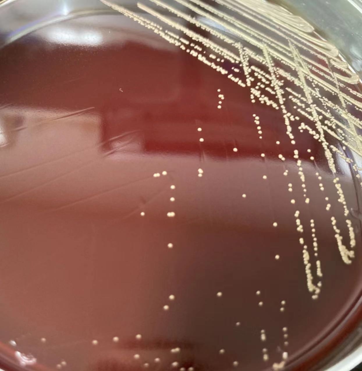 本文分享一株从二次供水样本中分离出的里拉微球菌的鉴别过程,对某份二次供水样本进行细菌总数、总大肠菌群的常规检测后发现该细菌总数严重超标(多为细小菌落),总大肠菌群检测合格。后利用过滤系统对水样进行过滤、增菌、分离培养(选择血平板、营养琼脂、EMA、BS、SS、MAC、TCBS等培养基,37℃,48h培养),在进行菌种分离培养同时,选取金黄色葡萄球菌标准菌种ATCC 25923为实验对照,进行菌株鉴定。发现血平板上优势菌落为淡黄色,带狭小溶血环;各类选择培养基上则基本无菌落生长,标准菌株ATCC 25923在血平板上呈白色圆形菌落,周围有明显β溶血环,见图1。