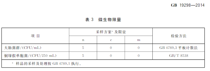 GB19298-2014 《食品安全国家标准 包装饮用水》取消了对包装饮用水的菌落总数规定;GB8537-2018《食品安全国家标准 饮用天然矿泉水》规定,大肠菌群为0。若超过国家标准规定可判断为不合格纯净水或矿泉水。