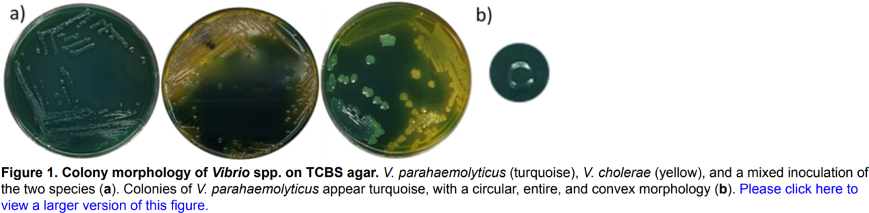 通常,TCBS培养基是用于分离和检测副溶血性弧菌、霍乱弧菌和创伤弧菌的选择性和差异培养基。然而,据报道,该培养基存在局限性,例如无法将霍乱弧菌与其他弧菌物种区分开来。此外,蔗糖和pH指示剂是TCBS的分化,正发酵反应伴随着pH指示剂溴百里酚蓝的颜色变化,但培养基的着色是TCBS的缺点,因为它可能会模糊对菌落形态的观察。因此,需要开发具有更好灵敏度和特异性的替代培养基,用于检测和分离副溶血弧菌和其他近亲菌种。