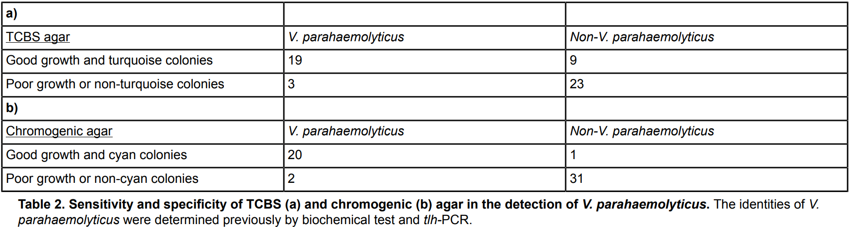 为了进一步比较显色琼脂和TCBS琼脂,计算了敏感性和特异性。表2显示了这些培养基准确识别副溶血性弧菌的能力。敏感性与真阳性率有关,这意味着副溶血性弧菌菌株在培养基上产生了预期的菌落形态。特异性与真阴性的百分比有关,这意味着非副溶血性弧菌菌株应表现出较差或无生长,或与副溶血弧菌不同的菌落形态。TCBS对副溶血性弧菌的敏感性和特异性分别为86.4%和71.8%。相比之下,显色培养基的敏感性和特异性分别为90.9%和96.9%。