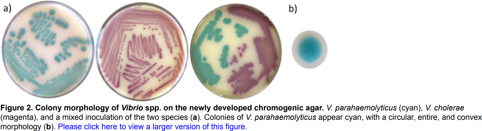 该研究测试了一种新配制的显色琼脂培养基,目的是提供一种更好的分离和区分临床相关弧菌的方法。这项研究评估了新显色培养基检测和分离霍乱弧菌、副溶血弧菌和创伤弧菌的能力,特别是其将副溶血性弧菌与其他物种区分开来的能力。并比较了新显色培养基和常规培养基检测副溶血性弧菌的灵敏度、特异性和检测限。