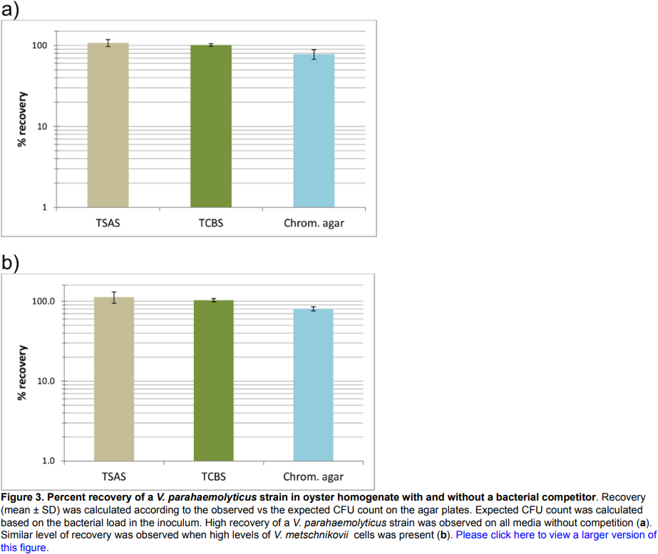 在存在牡蛎匀浆的情况下,显色琼脂继续显示出良好的回收率。换句话说,很大比例(>70%)的副溶血性弧菌细胞能够在生色琼脂上生长,不受牡蛎基质的影响(图3a)。副溶血性弧菌细胞的生长和恢复也不受另一种弧菌的影响(图3b)。这是一个重要的属性,因为环境样品必然含有不同的弧菌种类,特别是在富集程序之后,这些种类的数量很高。