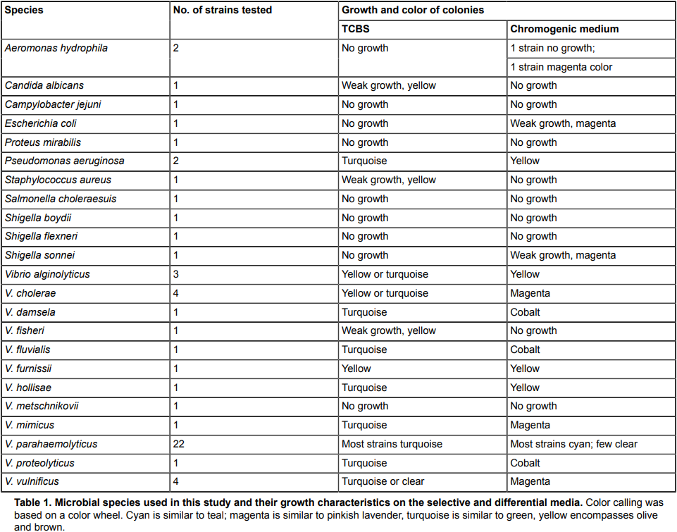 测试了一种新的显色培养基从食品和环境样品中选择临床相关弧菌物种的能力。此外,评估了该培养基同时区分这些物种的能力(图2)。如表1所示,TCBS和显色琼脂对非弧菌微生物都表现出一定程度的选择性。