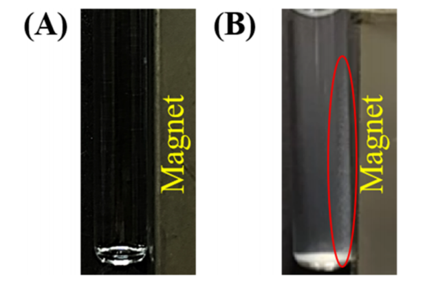图2 磁性Eu³⁺-细菌复合物的检测。(A) 图为仅含有pH 8的Tris缓冲液(0.39 mL)的空白样品照片,(B) 图为加入Eu³⁺(75 mM, 10 μL)处理后制备的金黄色葡萄球菌样品(0.39 mL, 0.5 mg/mL)的照片。样品在微波炉中加热(功率:180 W,时间:2.25 min)后,通过外部钕磁铁(约4000 G)进行磁性分离。照片在常规光照条件下拍摄。红色椭圆标记了磁性Eu³⁺-细菌复合物的位置。