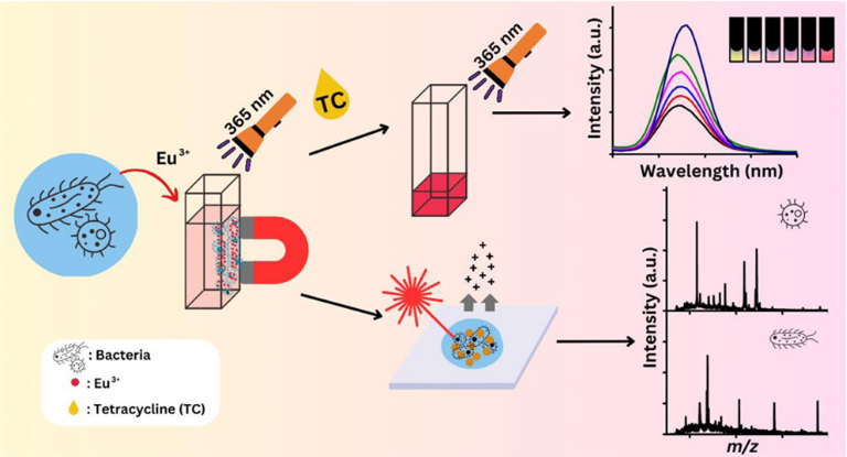 为了解决该问题,该研究旨在开发一种利用Eu³⁺的荧光和磁性双重功能检测致病细菌的快速传感方法。实验中使用了Eu³⁺乙酸盐作为磁性探针,并通过与四环素(tetracycline, TC)结合增强其荧光。使用的细菌包括革兰氏阳性和革兰氏阴性细菌,分别在特定培养基中培养。利用外部磁铁实现磁性分离,随后通过荧光光谱和MALDI-MS分析捕获的细菌。