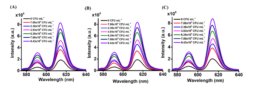 图3 定量分析。(A)-(C)使用Eu3+ (75 mM, 10 μL) 作为捕获探针,然后进行冲洗、漂白处理 (0.0625 %) 和添加 TC (30 μM, 30 μL),获得含有不同浓度金黄色葡萄球菌的样品 (0.39 mL) 的荧光光谱 (λex= 394 nm)。进行了三次重复。浓度为1 mg mL-1的金黄色葡萄球菌相当于7.86*109 CFU mL-1。