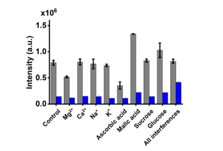 此外,研究了可能存在于真实样品中的干扰物质对传感结果的影响。干扰物质包括钾、钠、镁、钙等离子,以及葡萄糖、蔗糖、苹果酸和抗坏血酸等。通过实验分析,发现某些干扰物质(如Mg²⁺和抗坏血酸)会影响传感结果,降低荧光强度;而苹果酸则会增强荧光强度。然而,当所有干扰物质同时存在时,整体干扰效应很低,说明正负效应相互抵消。