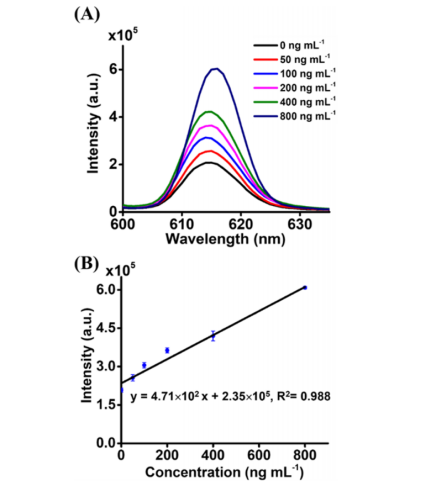 研究人员进一步验证了该方法在模拟真实样品中的应用。向500倍稀释的苹果汁中加入五种不同浓度的蜡样芽孢杆菌,使用本方法进行捕获和感应。图3A显示了得到的荧光光谱,并根据荧光光谱在616 nm处的强度与样品中添加的蜡样芽孢杆菌的浓度的关系得出图3B。因此,估计样品中的蜡状芽孢杆菌浓度为499 ng mL−1,接近加标浓度500 ng mL−1。