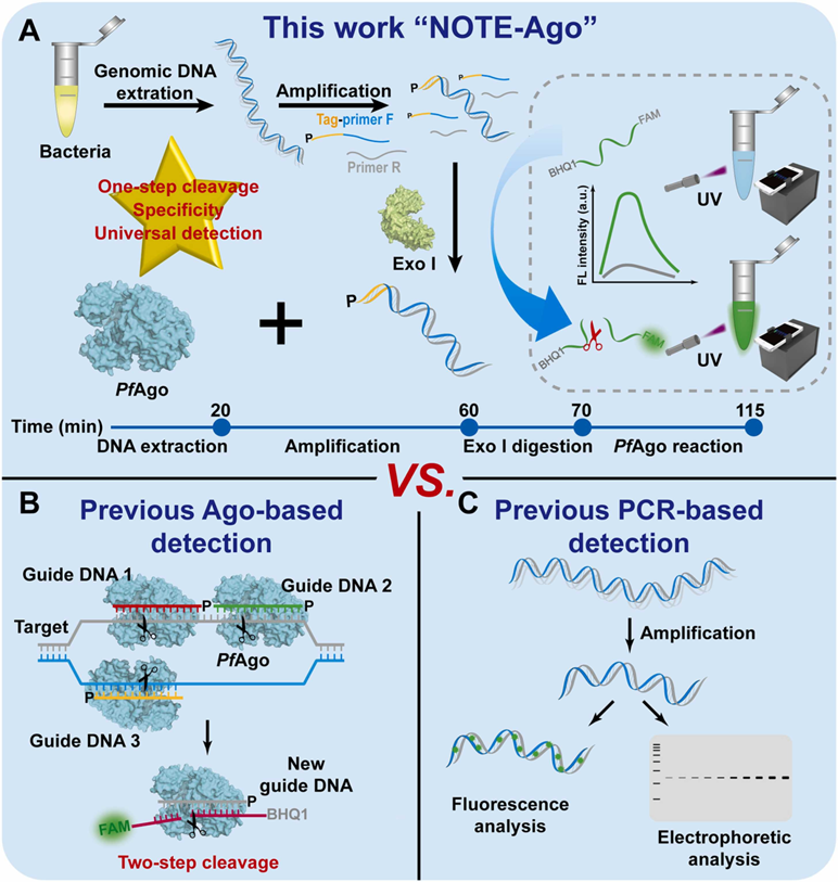 Figure 1. Schematic diagram of the proposed NOTE-Ago assay based on PfAgo system (A), previous Ago-based detection (B) and PCR-based detection (C).