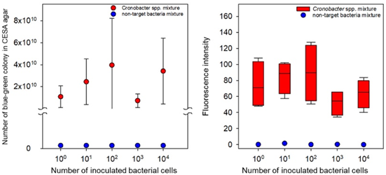 根据荧光强度,蓝绿色菌落(代表克罗诺杆菌属)仅在含有克罗诺杆菌的混合物中检测到,而在使用所选适体仅含有非目标细菌的混合物中未检测到。这一发现表明,所选择的适体可以有效地检测克罗诺杆菌。在第二次富集培养液中,减少了总分析时间: