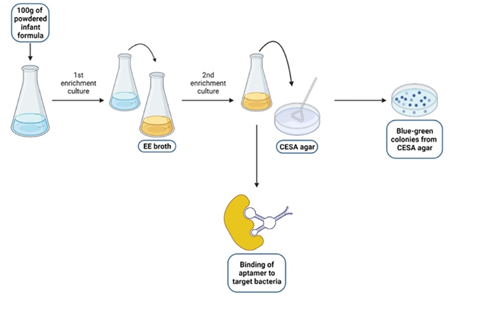 研究人员使用受污染的PIF进行适体检测测试,以确认适体可用于克罗诺杆菌的检测,该测试改编自韩国食品和药物安全部提出的基于培养的方法: