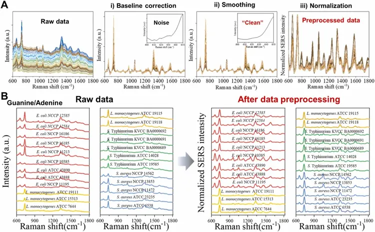 快速准确的病原体检测至关重要,但传统方法存在局限性。表面增强拉曼散射(SERS)技术具有灵敏、快速、无损等优势,尤其无标记SERS无需复杂标记,可直接检测细菌的固有振动指纹。然而,SERS分析面临信号峰重叠和咖啡环效应导致信号不均匀等挑战。为解决这些问题,机器学习(ML)与数据预处理技术结合,可有效去除噪声和背景干扰,提高SERS数据分析的准确性,为病原菌的快速鉴定提供了新的途径。