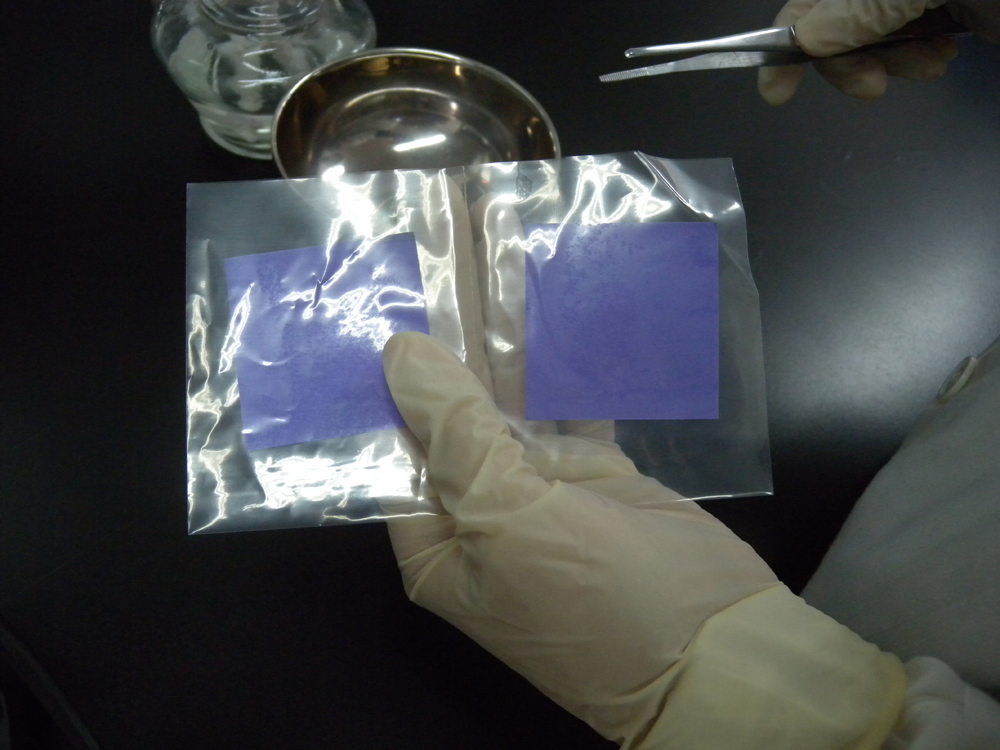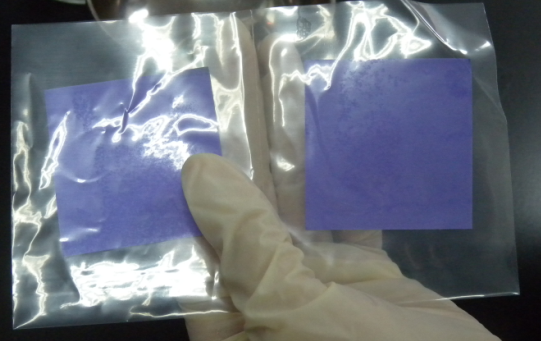 2.1.2 立即将湿纸片置于两连无菌袋中,每袋各放入1片湿纸片。(每张湿纸片的面积是25cm2,每份两连袋所放纸片总面积50 cm2)