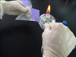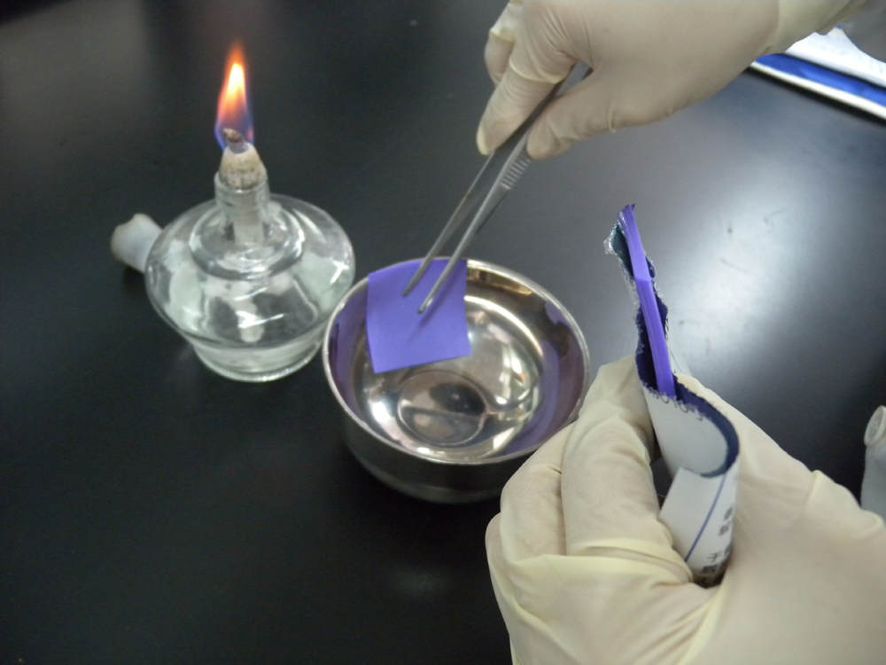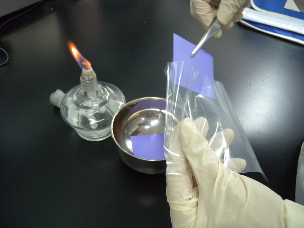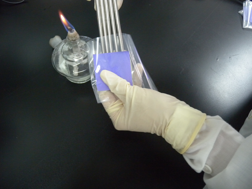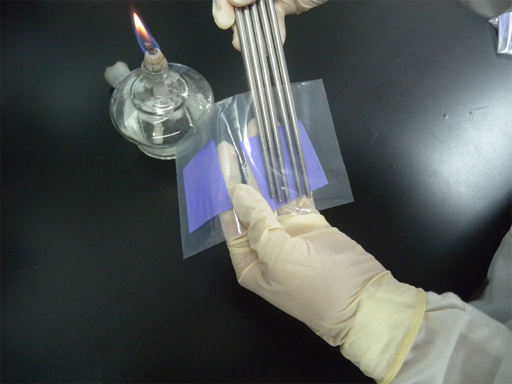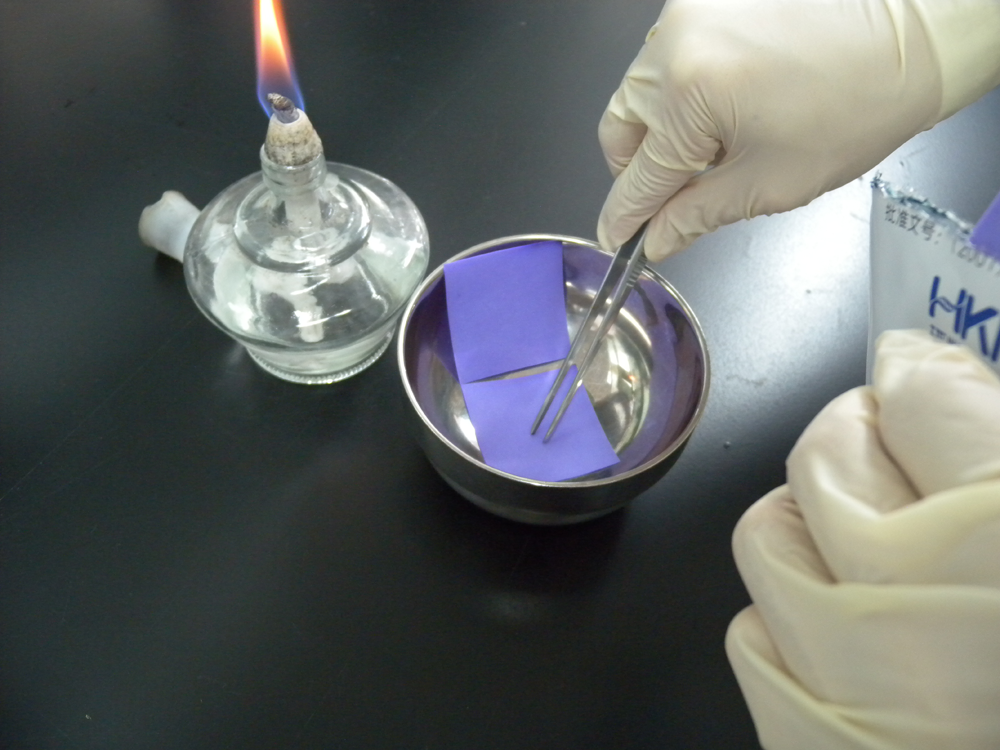 2.1.1 然后用75%酒精棉擦拭消毒双手和检验台,点燃酒精灯,用75%酒精棉球擦拭纸片包装袋袋口,在酒精灯旁撕开,然后打开装有两连无菌袋的封口袋袋口,取出两连无菌袋,用无菌的镊子从中夹取出湿纸片。