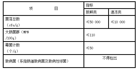 根据《中华人民共和国商业行业标准 粽子》(SB/T 10377—2004),速冻粽子和新鲜类粽子需检验菌落总数、大肠菌群、霉菌总数及其它致病菌(系指肠道致病菌及致病性球菌),而真空包装类粽子的微生物指标应符合罐头食品商业无菌的要求。此外,《食品安全国家标准 速冻面米制品》(GB 19295—2011)对速冻粽子的菌落总数、大肠菌群、金黄色葡萄球菌、沙门氏菌的限量都有相应规定。具体限量要求如下: