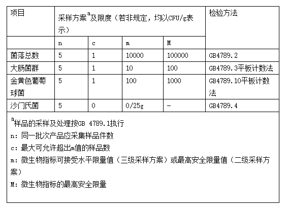 菌落总数;大肠菌群;霉菌;沙门氏菌;金黄色葡萄球菌。